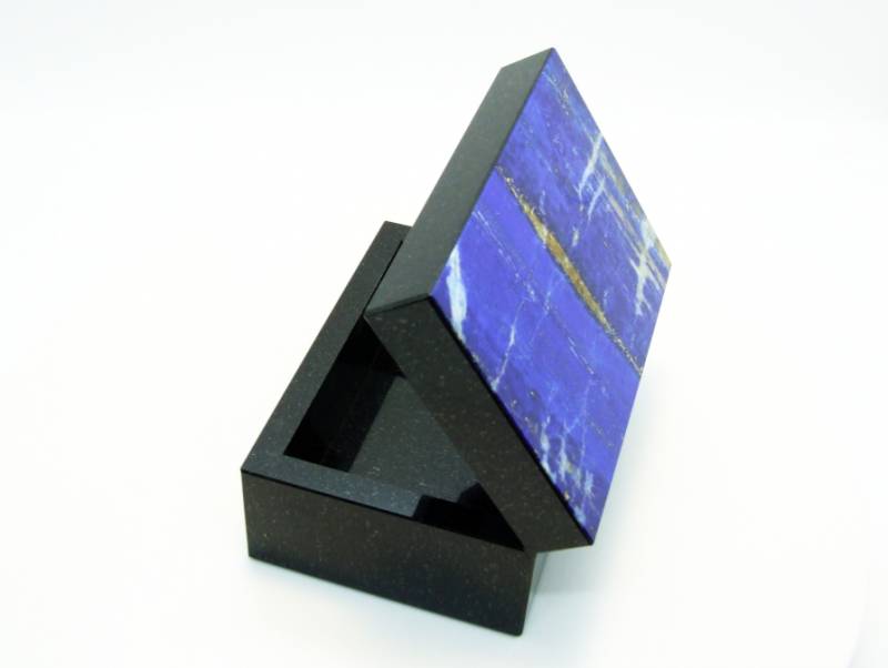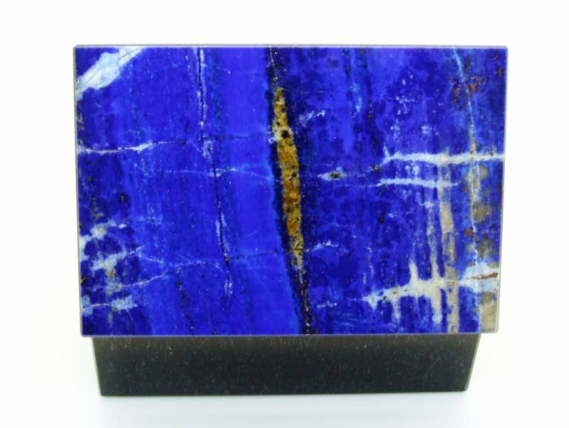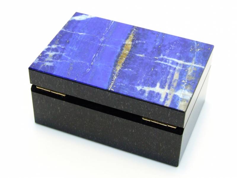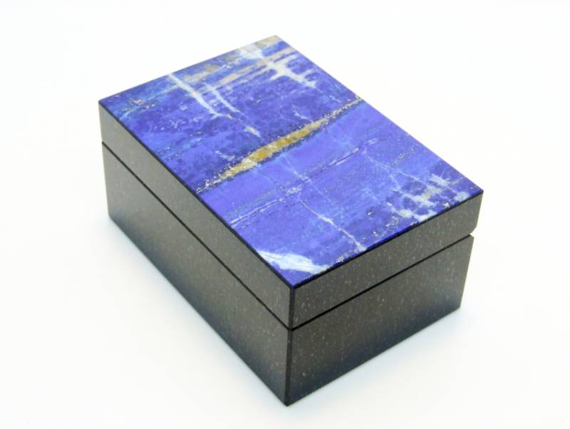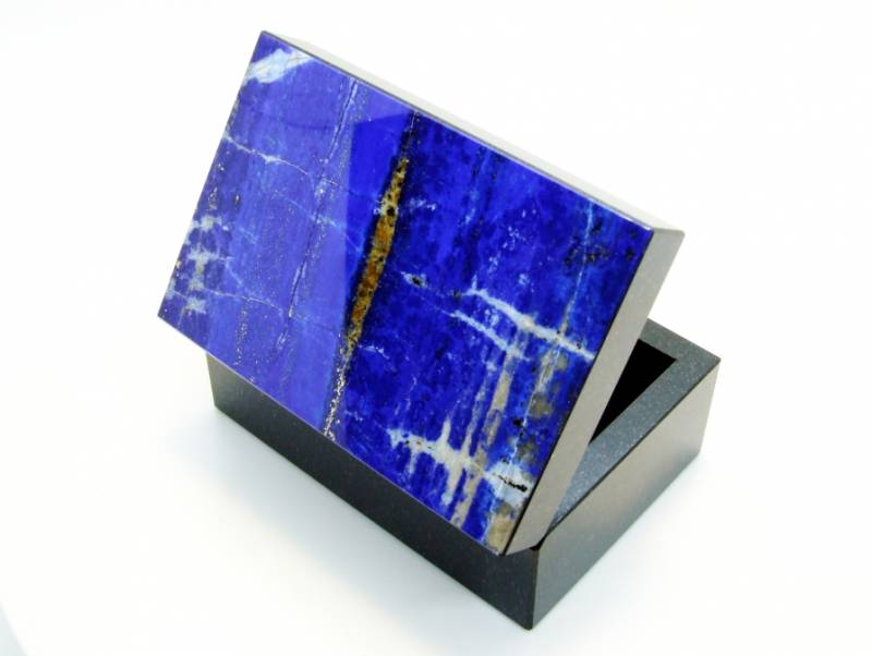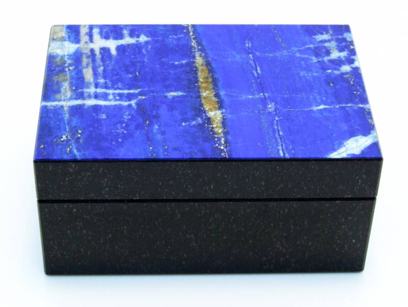 В разных странах и регионах добывают лазуриты разных оттенков. Но самыми ценными считаются лазуриты из Афганистана, которые еще называются "Бадахшанскими". Именно лазурит из Афганистана и стал украшением этой шкатулки, он называется "Ниили" — самый дорогой камень сочного синего цвета, обладающий золотистыми прожилками.