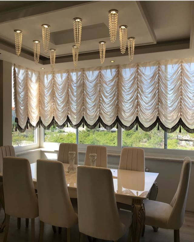 Французские шторы – это вид декоративных занавесок для окон, характерная черта которых – каскадные ряды драпировок-фестонов, поделенные на присборенные вертикальные секции. Шторы во французском стиле могут быть как разновидностью римских жалюзи (то есть иметь подъемный механизм), так и цельным полотном наподобие классического тюля. Главная функция таких моделей – украшение интерьера: особой практичностью они не обладают, поскольку почти не затеняют помещение. Еще одно название таких штор – маркизы. Поскольку главная функция французских штор в интерьере – украшать, а не затенять, для их производства используются легкие полупрозрачные ткани, которые обладают выраженной фактурой и красиво драпируются.