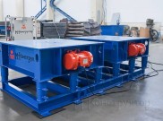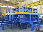 Подачу бетонной смеси осуществляет бетонораздатчик портального типа объемом 2 мᶾ, перемещающийся по рельсовым путям. Оснащен челюстным шибером выгрузки с шириной 2000 мм. Затворы имеют гидравлический привод. Бетонораздатчик оснащен двумя распределительными валками/шнеками – спиральным и игольчатым, приводящимися в движение электромеханическим приводом. Управление реализовано со шкафа управления и продублировано радиопультом.