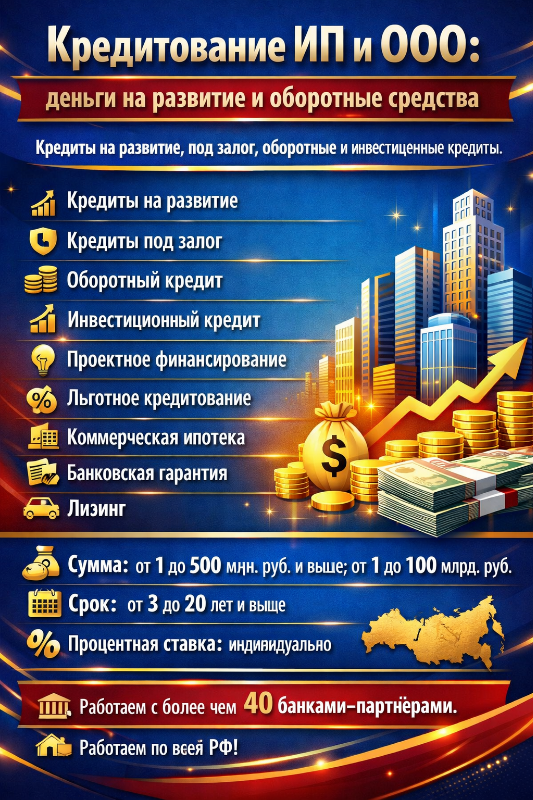 ! Поможем получить кредит ИП, ООО с НУЛЕВЫМИ ОБОРОТАМИ в размере 5 -10 млн. рублей. Требования: Наличие хорошей кредитной истории, отсутствие долгов в ФССП, судебных требований, долгов в налоговой. Срок регистрации ИП от 6- 9 месяцев.