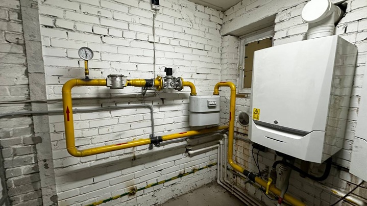 Отопление: газовое — 2 новых котла + 8 калориферов